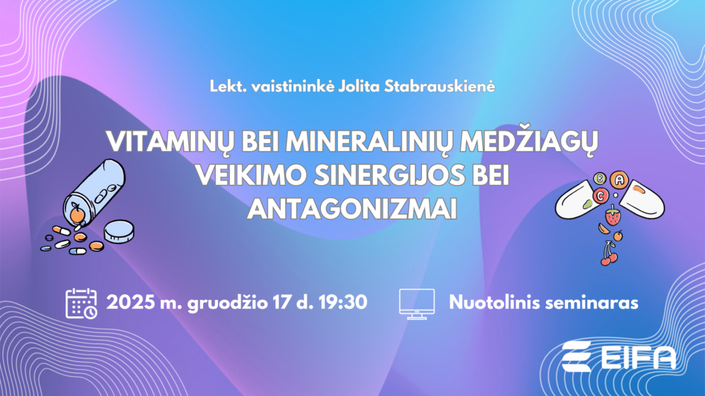 SeminarasVitaminų bei mineralinių medžiagų veikimo sinergijos bei antagonizmai 17 gruodžio 2025 19:30 - 22:30 Nuotoliu